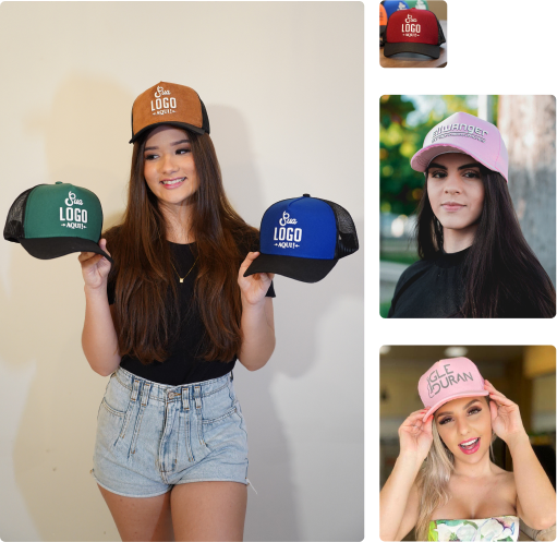 Por exemplo: Em um pedido de 60 bonés do tipo trucker, você pode escolher até 3 modelos diferentes, respeitando o mínimo de 20 unidades em cada modelo.